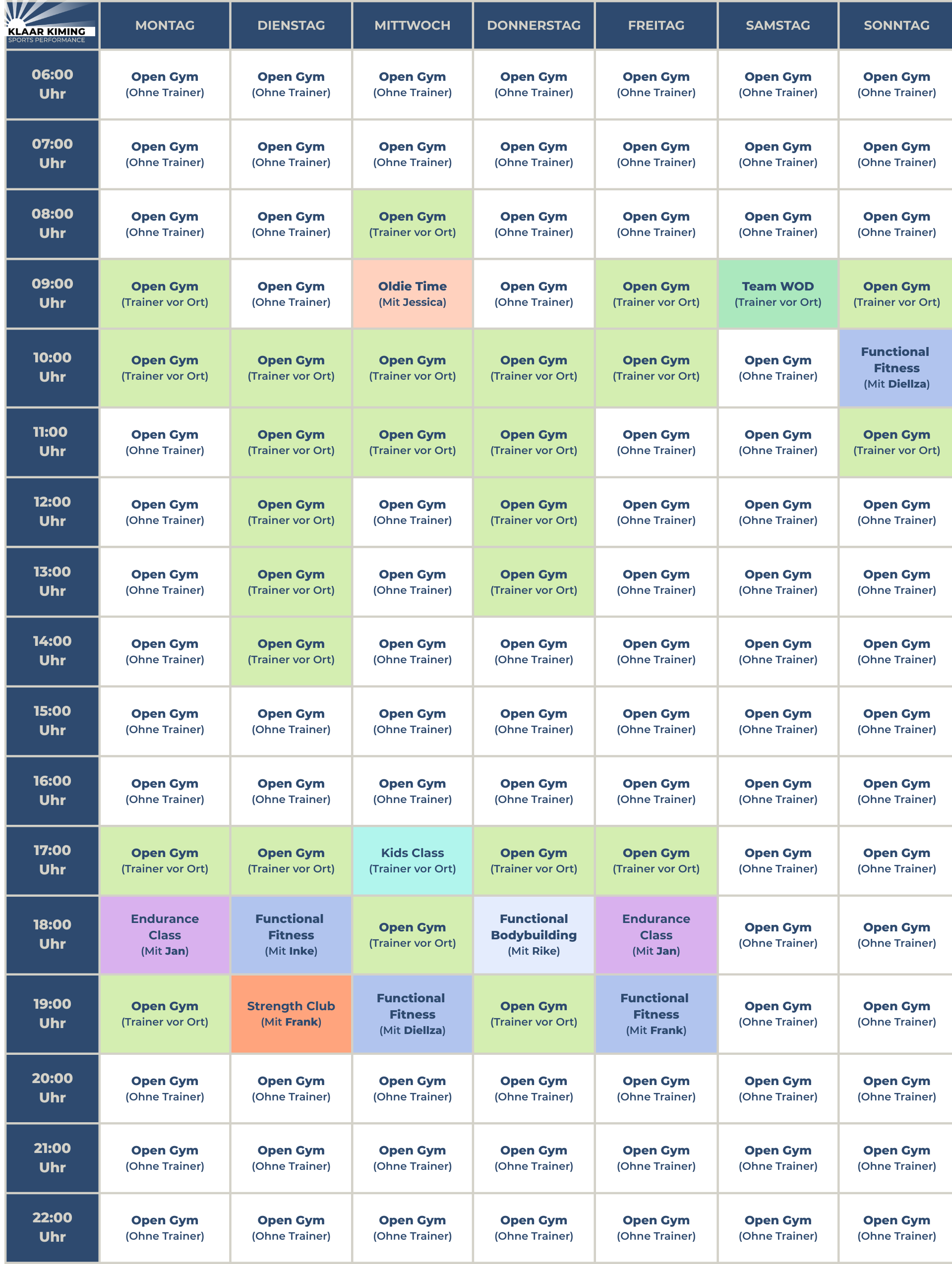 Hier findet ihr unseren aktuellen Kursplan. Sofern es Änderungen, neue Kurse oder neue TrainerInnen gibt, werden wir den Kursplan aktualisieren.